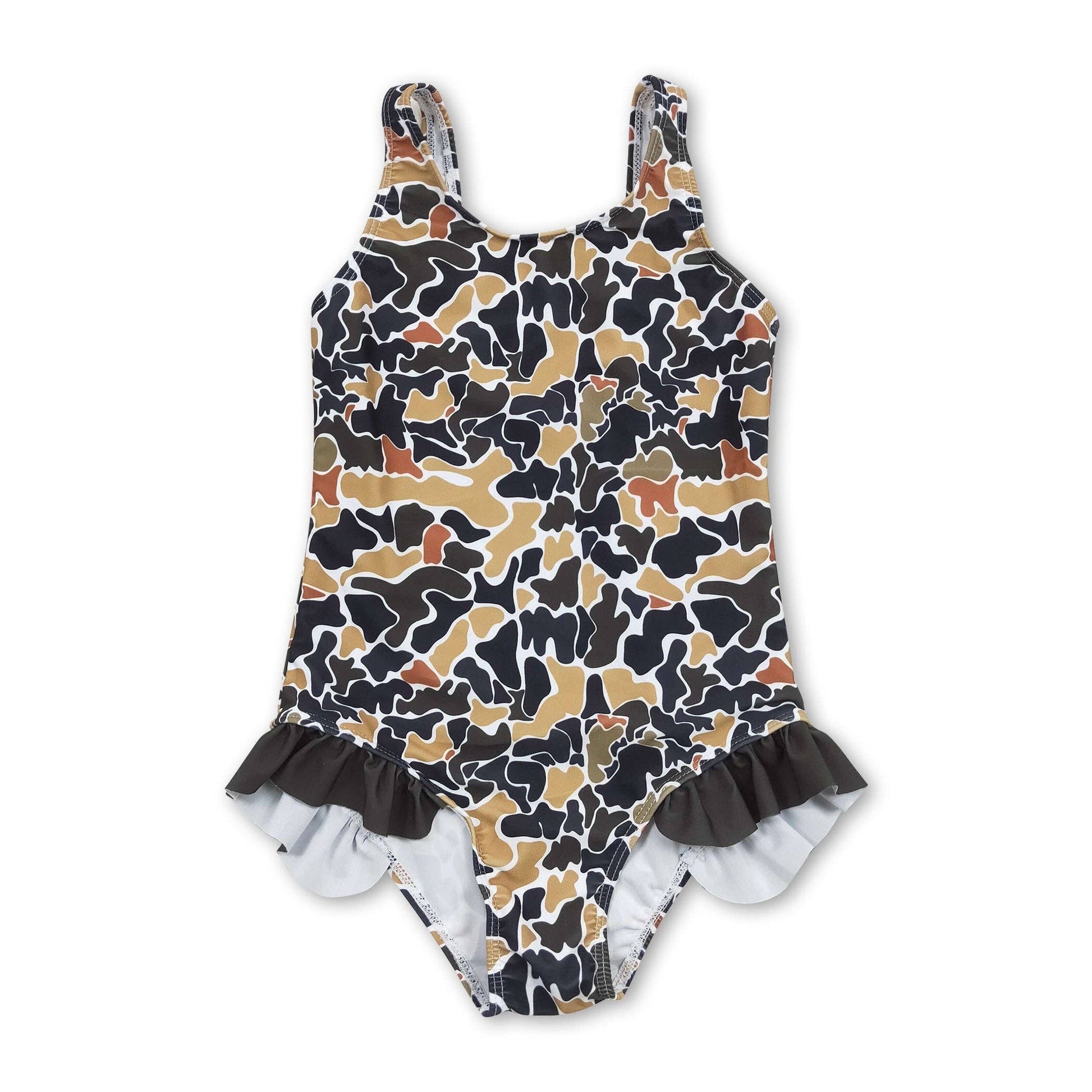A girly twist on a rugged favorite — this brown camo one-piece features playful black ruffles at the hips. Fully lined for comfort and perfect for pool days or beach trips.